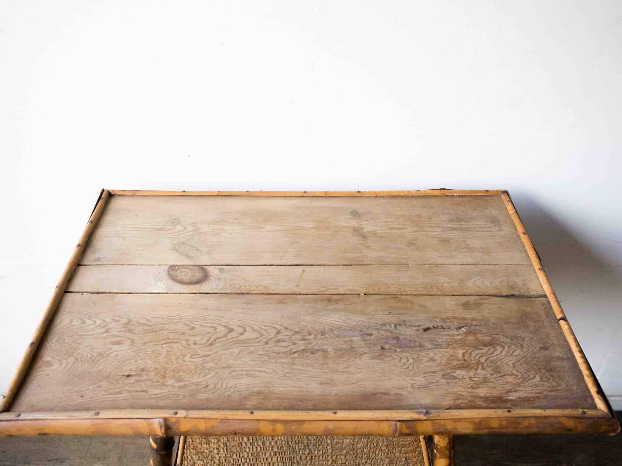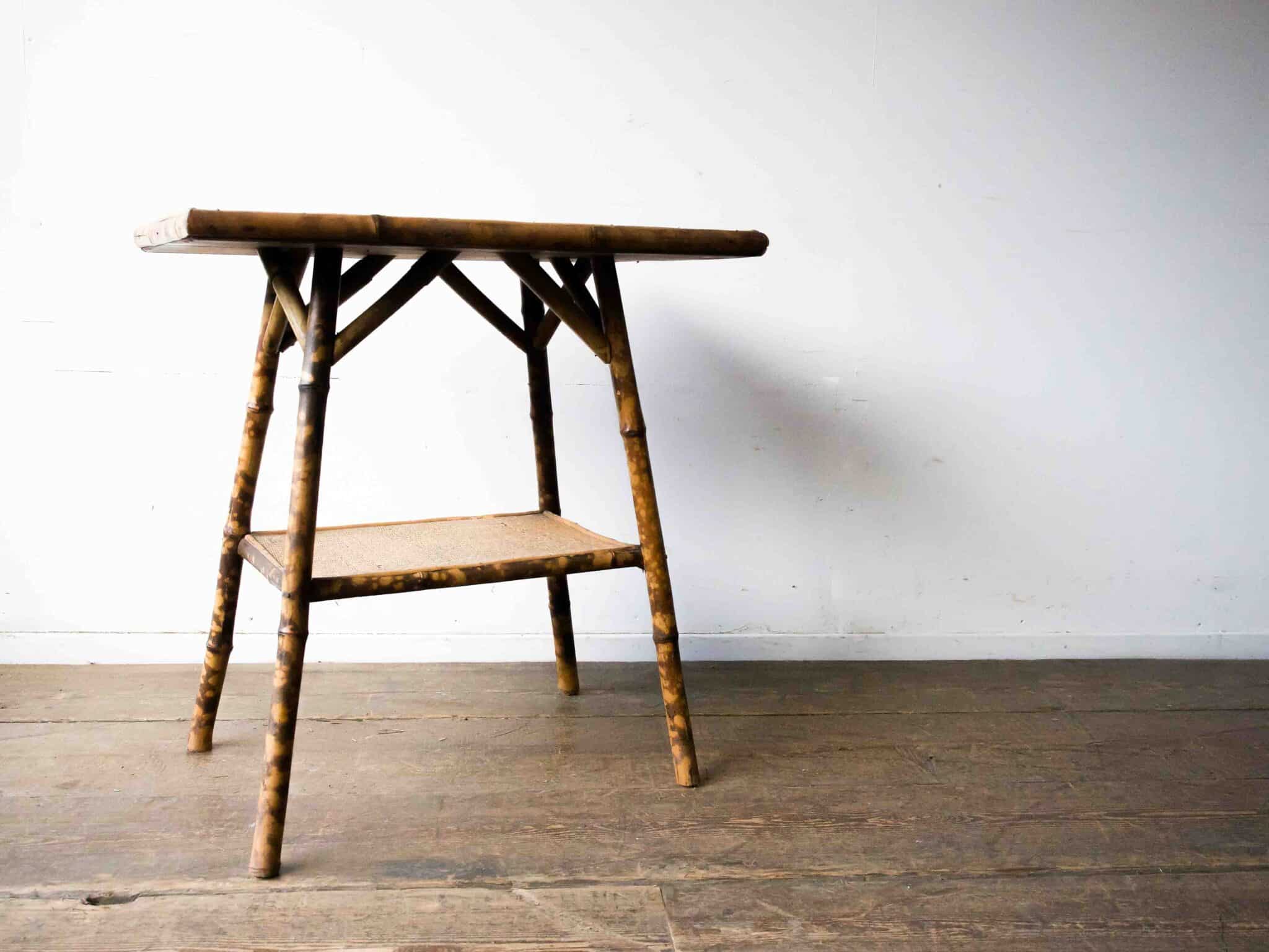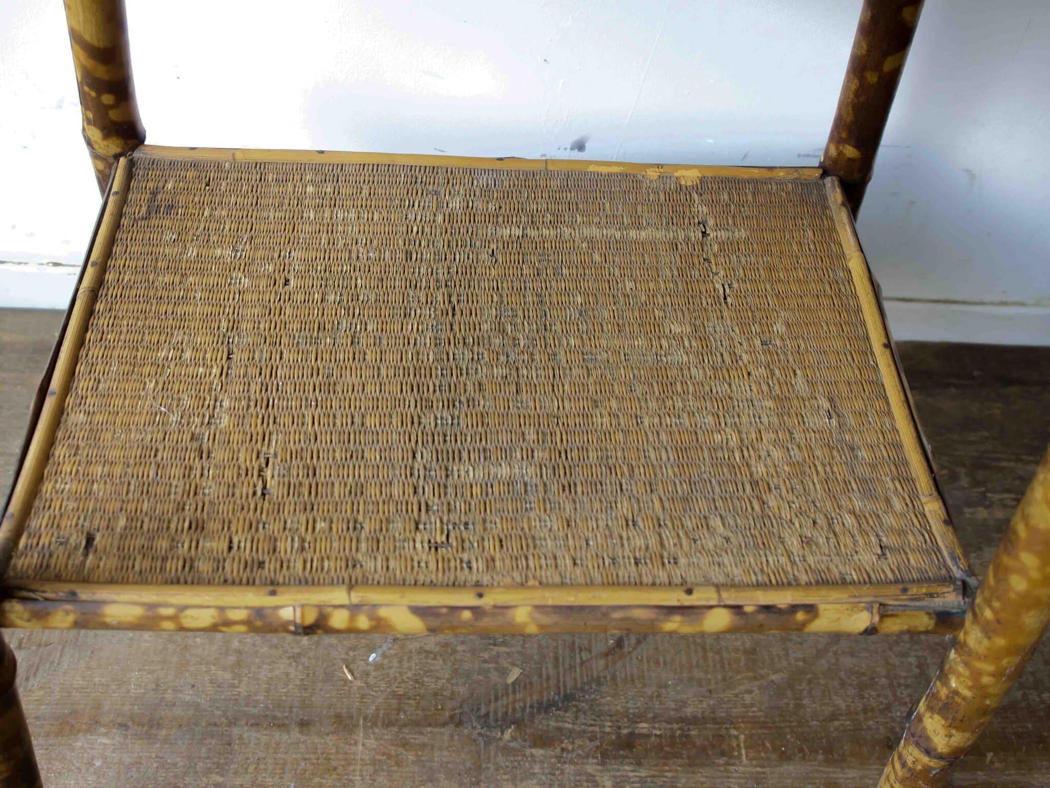 A charming late Victorian two tier, bamboo side table. These tables were associated with the late 19th century’s Aesthetic Movement and renewed interest in exotic and often Asian inspired design. Constructed primarily from slender bamboo stalks with a solid pine top and a rattan surface on the bottom shelf. A decorative piece ideal as a plant stand, lamp table or just as a pretty side table.