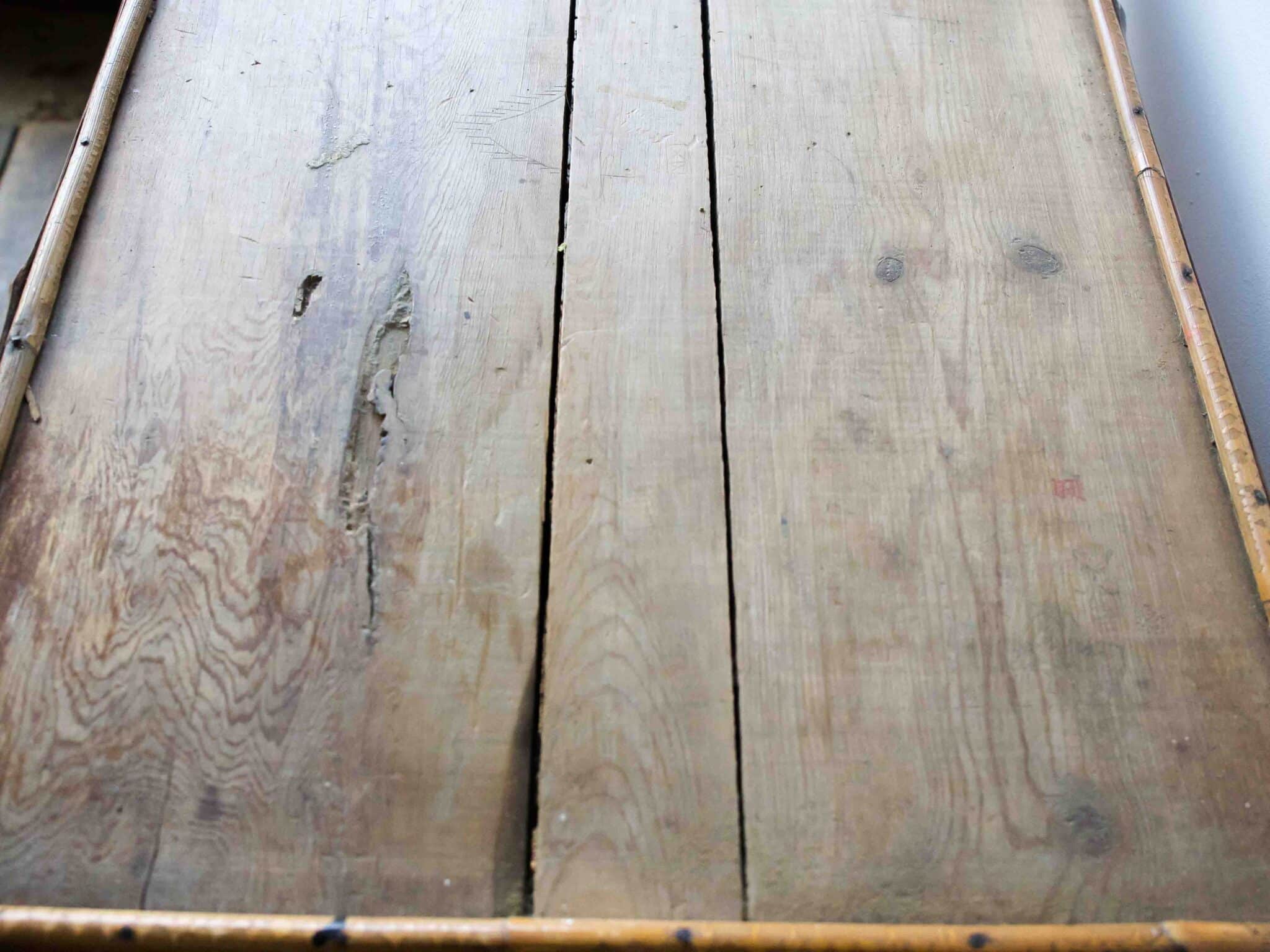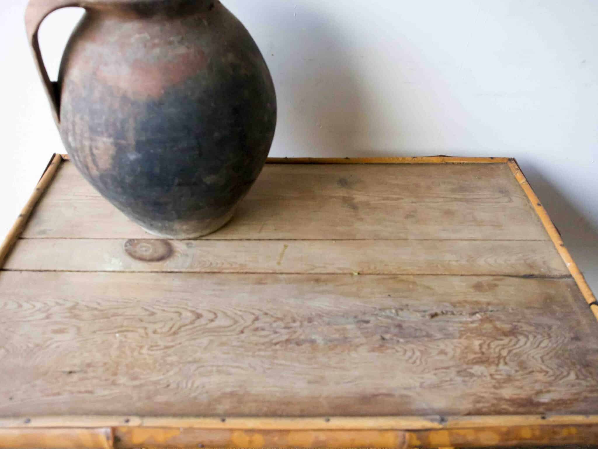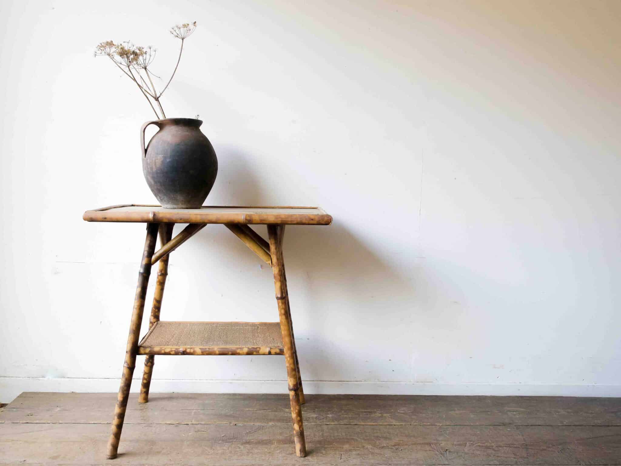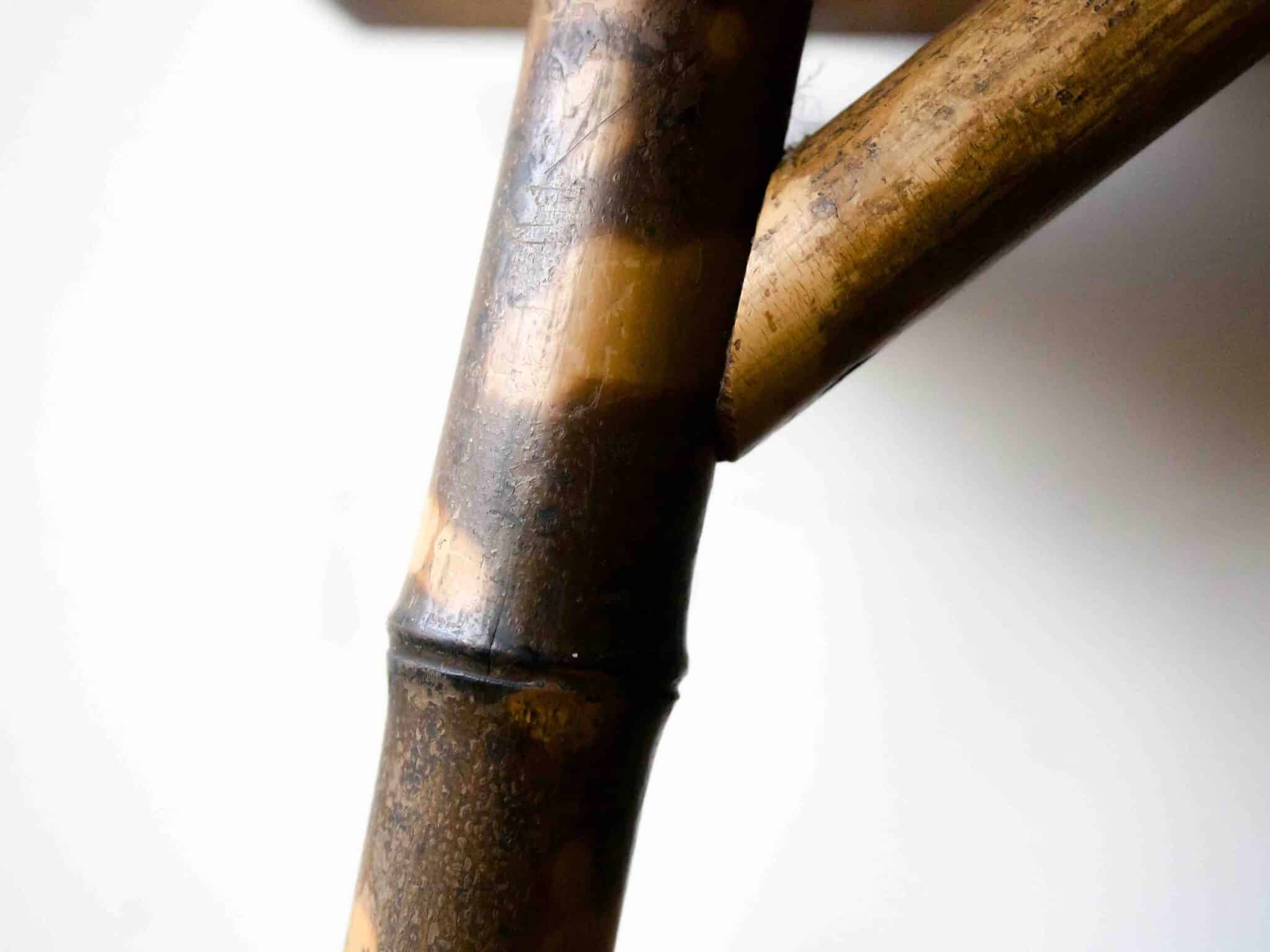 A charming late Victorian two tier, bamboo side table. These tables were associated with the late 19th century’s Aesthetic Movement and renewed interest in exotic and often Asian inspired design. Constructed primarily from slender bamboo stalks with a solid pine top and a rattan surface on the bottom shelf. A decorative piece ideal as a plant stand, lamp table or just as a pretty side table.